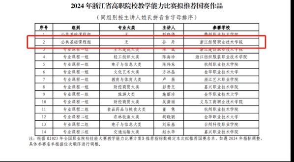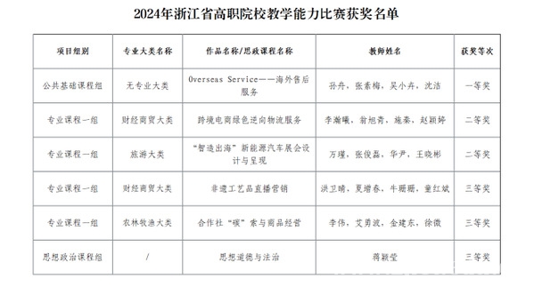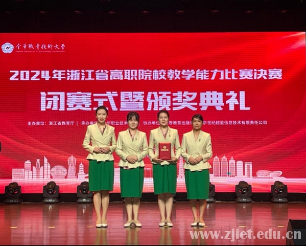 7月30日,2024年浙江省高职院校教学能力比赛决赛在金华职业技术大学落下帷幕。经过激烈角逐,我校共获一等奖1项,二等奖2项,三等奖3项。其中,公共教育学院孙舟、张素梅、吴小卉、沈洁团队的作品《Overseas Service--海外售后服务》荣获公共基础课程组一等奖,并成功入选国赛拟推荐名单,至此我校教师团队已连续两年获得国赛入场券!数字贸易学院李瀚曦团队和创意设计学院万瑾团队获专业课程一组二等奖;商务智能学院洪卫晴团队和合作经济学院李伟团队获专业课程一组三等奖;马克思主义学院蒋颖莹获思想政治理论课程组三等奖。